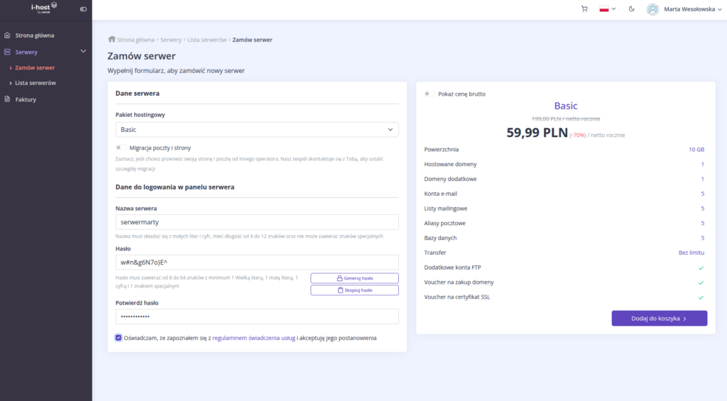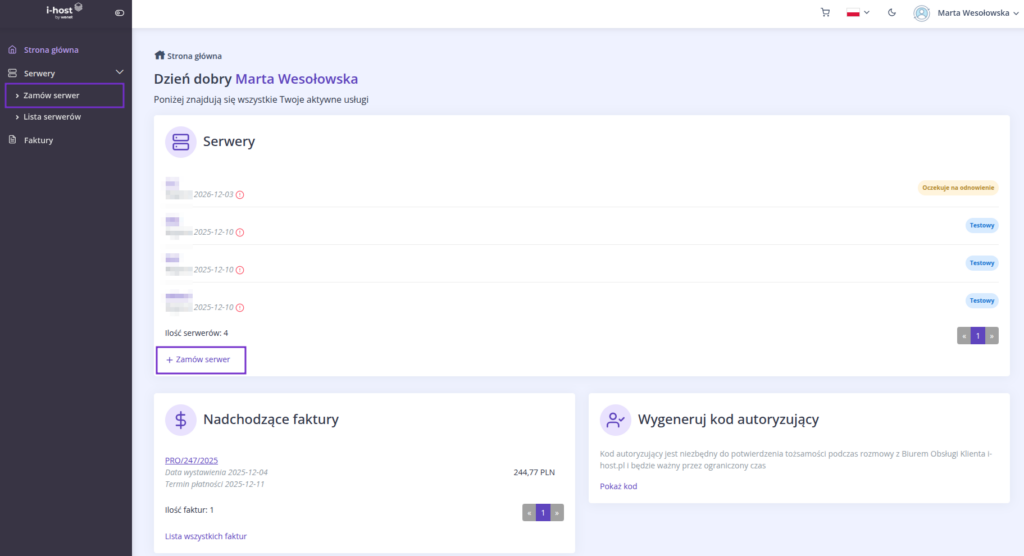 Nowy serwer możesz zamówić w panelu klienta: Zaloguj się na swoje konto, a następnie w menu po lewej stronie znajdź i kliknij przycisk „Zamów serwer”.