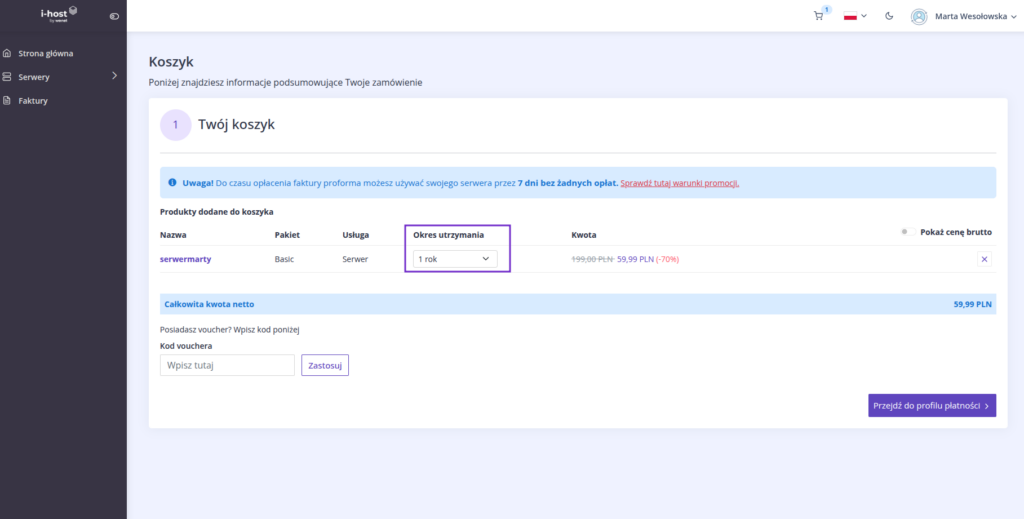 W koszyku znajdziesz dodane produkty. W tym miejscu możesz wybrać okres trwania abonamentu oraz możesz wykorzystać voucher, jeśli taki posiadasz.
