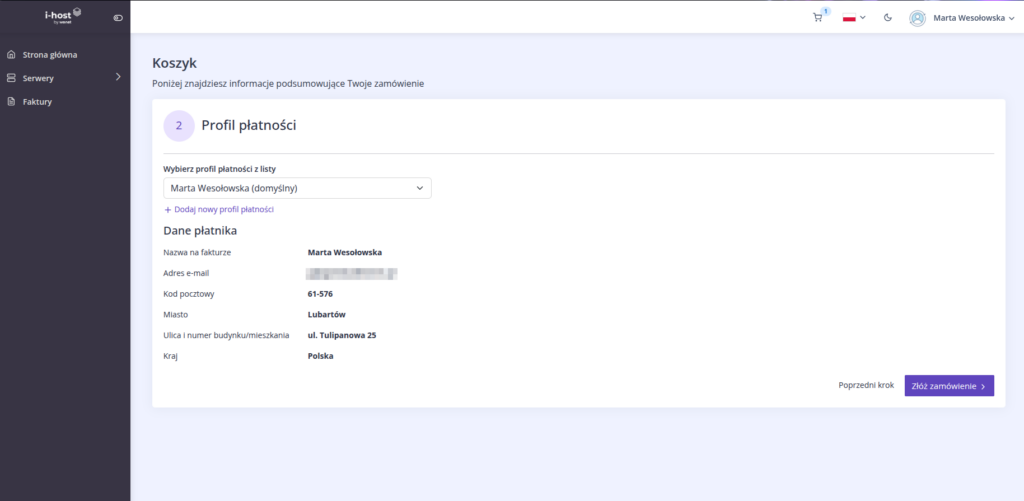 Po potwierdzeniu zamówienia w koszyku wybierz jeden z zapisanych na Twoim koncie profili, na który wystawimy fakturę.