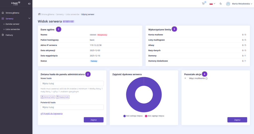 Zarządzaj swoimi serwerami łatwo i wygodnie dzięki naszemu panelowi klienta. Po zalogowaniu wybierz z menu po lewej stronie zakładkę Serwery i kliknij na interesujący Cię serwer, aby uzyskać dostęp do szczegółowych informacji.