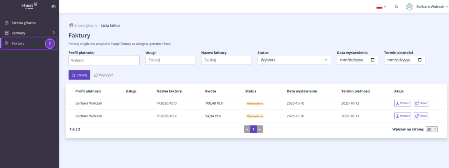 Wszystkie wystawione przez nas faktury proforma oraz faktury VAT znajdziesz w zakładce Faktury w swoim panelu klienta www.panel.i-host.pl.