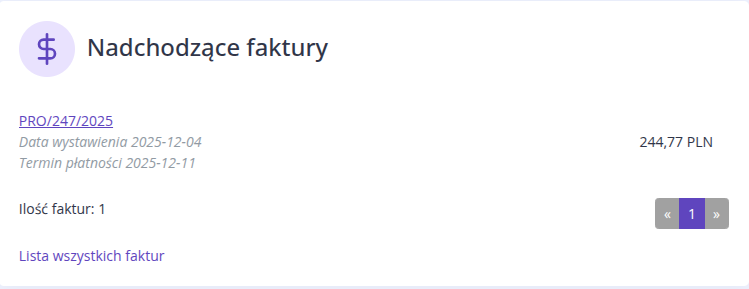 Jeśli posiadasz faktury proforma, dla których zbliża się termin płatności, zobaczysz je również bezpośrednio na stronie głównej panelu klienta. Dzięki temu szybko sprawdzisz, które faktury wymagają opłacenia.