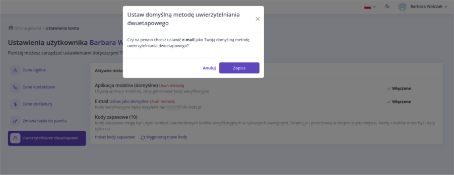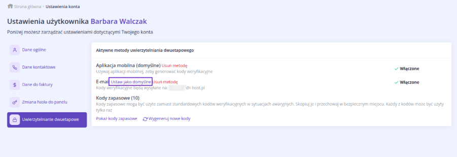 Jeśli masz włączone obie metody uwierzytelniania dwuskładnikowego (np. e-mail oraz aplikację mobilną), w panelu pojawi się opcja „Ustaw jako domyślne” przy metodzie dodanej jako ostatnia.
