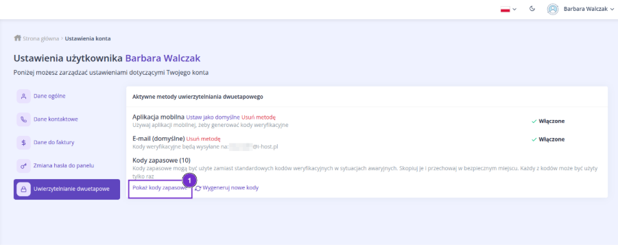 💡 Kody zapasowe to alternatywny sposób logowania w przypadku utraty dostępu do adresu e-mail. Zapisz je w bezpiecznym miejscu — np. w menedżerze haseł lub offline. Z każdego kodu możesz korzystać tylko raz.