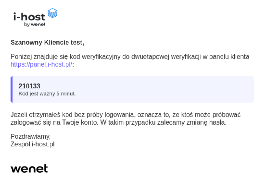Aby zwiększyć bezpieczeństwo swojego konta w panelu klienta www.panel.i-host.pl, możesz włączyć uwierzytelnianie dwuetapowe (2FA) z wykorzystaniem adresu e-mail.