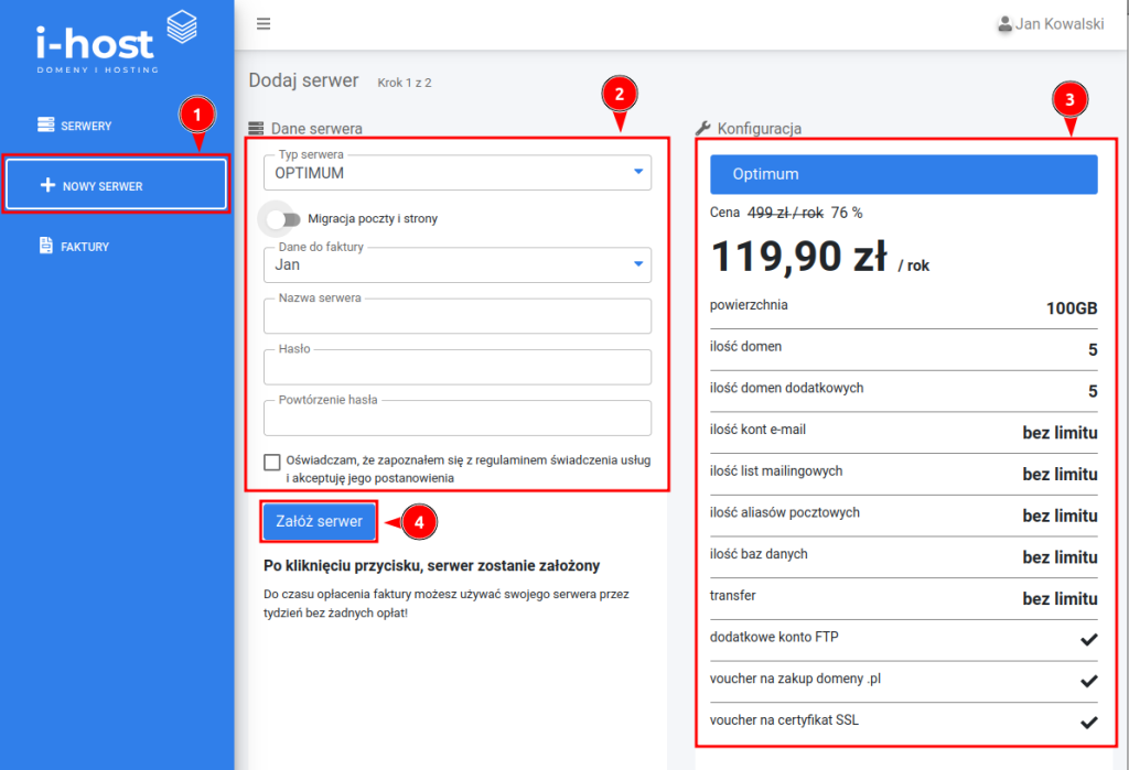 - Typ serwera: Upewnij się, że wybrany jest pakiet hostingowy, który Cię interesuje